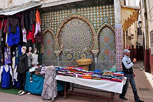 Fontaine à l’angle de la rue des Consuls et de la rue Harrarine, devant laquelle a lieu chaque jeudi matin le souk aux tapis.